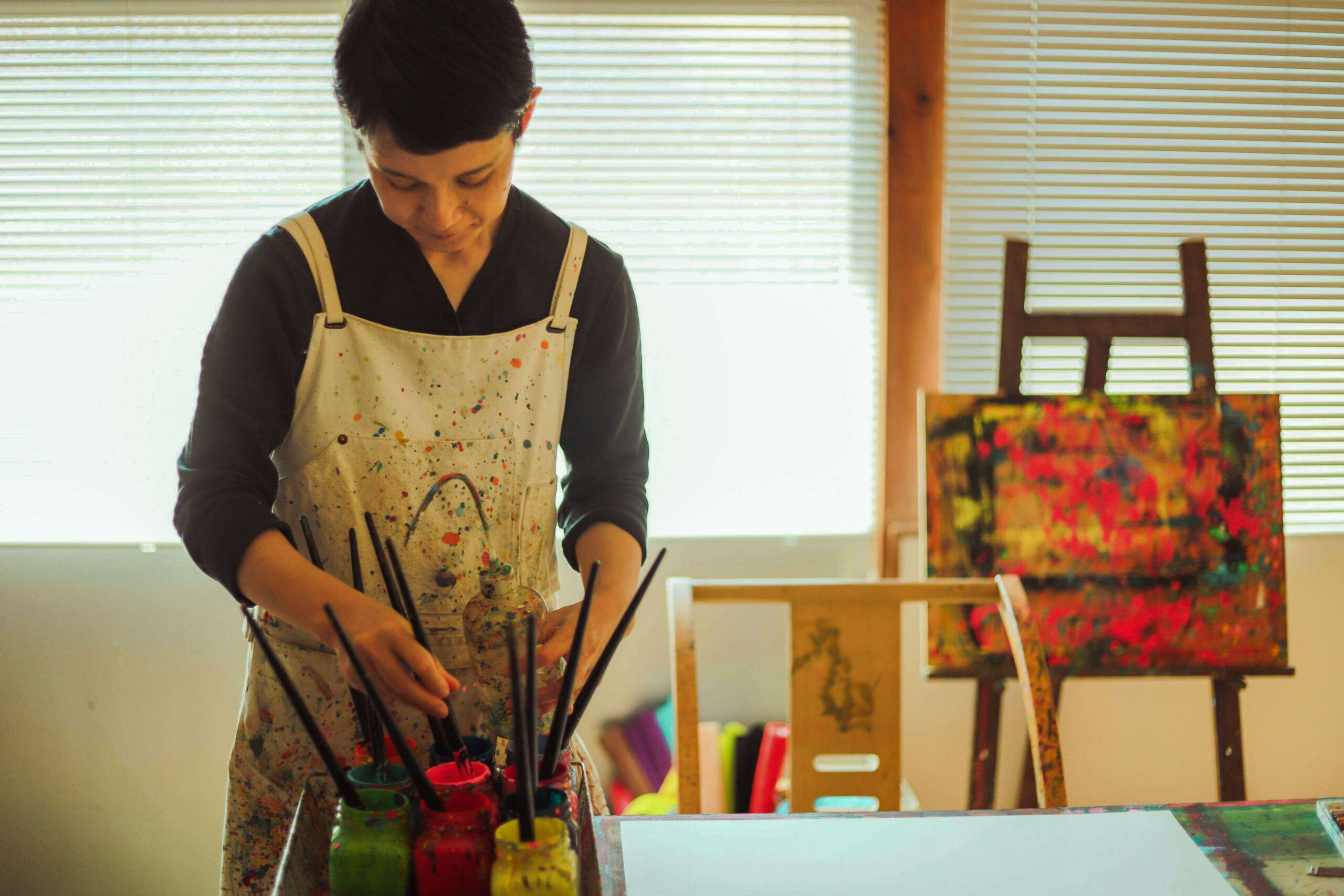 1982年福岡県八女市生まれ。武蔵野美術大学芸術文化学科卒。 静岡の児童福祉施設にて障がいをもつ子どもたちと生活をともにしながら、美術の時間、展覧会を担当。その後ダウン症の人たちのための制作の場「Atelier Element Present」東京スタッフとなる。一緒に過ごした時間、呼吸をするように生みだされる作品と空気感が忘れられず、移住先の島根県浜田市にて2016年「Atelier Sunoiro」をはじめる。